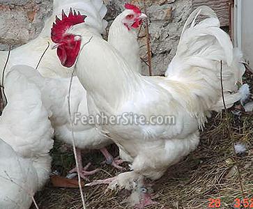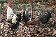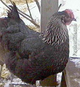 This breed, which originated in western France in the town of Marans, is best known for its dark chocolate colored eggs. It is a fast grower and does well in damp areas, having been developed in a marshy portion of France. The original French birds have feathered legs, but this characteristic has been bred out of the British and many American lines. The French recognize 8 varieties: 1. Silver Cuckoo, 2. Golden Cuckoo, 3. White, 4. Coppered Black, 5. Black, 6. Wheat, 7. Black-tailed Fawn, and 8. Ermine; they are considering adding the Silvered Black (created since 1932 and remarkable for the color and spherical form of its eggs). In the Cuckoo Marans, males are lighter in color than females--it is said to be possible to color sex them even as chicks with pretty good accuracy. I've never seen or heard about the other varieties.