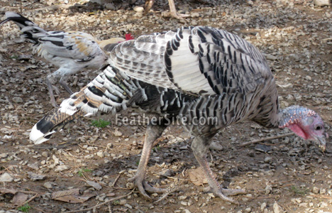 . . . Historically, this was the turkey of New England. It takes its name from the Narragansett Bay area. Some authors have suggested an exotic origin for the Narragansett, suggesting it may have come originally from Mexico or Central America. While this suggestion seems to have little basis, some of its ancestry did come from that area, but by way of Europe. Such turkeys, crossed with local wild turkeys, produced the Narragansett. It could, in fact, be considered an intermediate step in the production of the Bronze. Early writers praised the quality of its meat as well as its egg production. I can't disagree with that, but perhaps I should warn you that this is my favorite turkey. It's an active bird; but when kept at liberty, doesn't wander too far from home. It is also a good mother. The pattern is similar to the Bronze, but bronze is replaced with steel gray and the brown in the tail is a lighter tan. The gray has a slightly golden or brown tint. . . . My preference for the Narragansett is based mostly on a calm disposition and size. A grown out young Narragansett will feed you, your family, your friends, your neighbors and a few people you don't even like, [whereas] even the standard Bronze is too much turkey for general use.