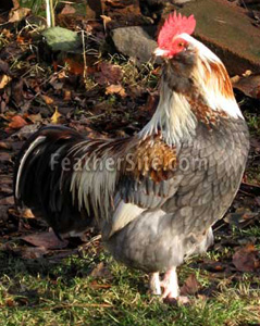 The Faverolles were used as a utility breed known for their excellent table qualities and superior egg laying during winter months. The French have a dish for which the Faverolles was used exclusively. It is called "Petite Poussin" or "Small Breast." Today they are regarded as a show fowl and are rare in the United States. They are said to be the Peacock of the poultry world for their contrasting color between the sexes and the brilliance of color in the male birds. They make excellent back yard fowl and have a genteel personality.