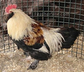 The overall shape of the bird should be trapezoidal and the feathering rather fluffy. Wide backs and chests are a necessity. Deep in keel with carriage well centered. Revered in the females are feathers that go backwards in the side of the hackle. The beard and muff should be extreme with little to no wattle at all. Fullness of beard is desired over length, with the beard covering the ear lobe. Face , comb, and earlobe should be red. Eye color red bay. The comb is single, and medium in size with five points and no serrations. This breed has five separate toes and skin and leg color are white. Light feathering should appear on the outside of the leg and outer toes. There is a slight break between the feathers of the body and leg. The leg feathering of the Cochin is not what is desired. Type should always be given preference over color, not only in the show pen, but in the breeding pen as well.