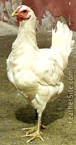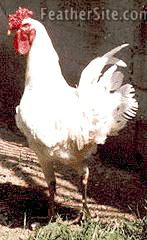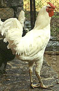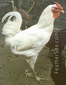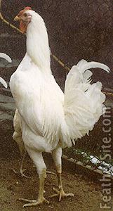 This white bird has long legs and a long neck. It is squirrel-tailed with a rose comb, red eyes, yellowish green legs and feet and a yellow beak. It must be pure white -- no spotting is allowed. The roosters weigh 3-3.5 kg and the hens 2-2.5. Chicks are yellow with yellow legs. The hens are nonsitters and produce 80-100 eggs per year.