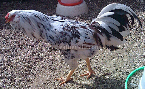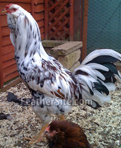 A pen of Spangled Orloffs. The color of the hens is fairly clear in this image. They are very attractive birds. The spangling increases with age. The cockerel on the left will develop a more marked plumage as he grows.