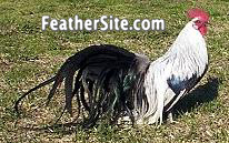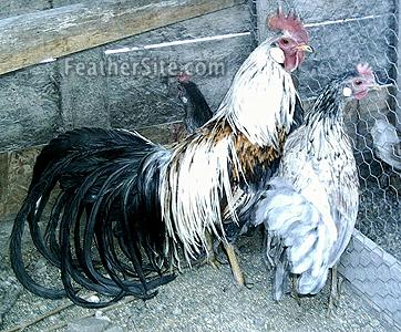A Silver Phoenix rooster with a nice tail on the left and a rooster with a great tail on the right