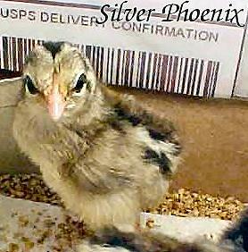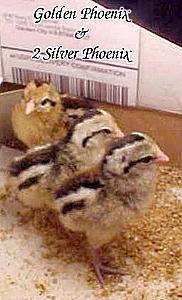 Newly hatched and day-old Golden Phoenix bantam chicks Two-day-old and week-old Golden Phoenix bantam chicks A Silver Phoenix chick Silver and Golden Phoenix chicks