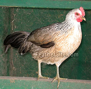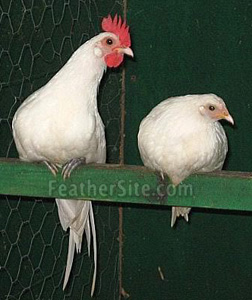 A Modern Silver Phoenix hen on the left and another Silver rooster on the right