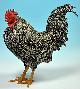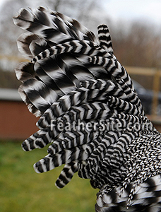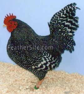 Suffolk Chequers were developed by Trevor Martin starting in the 1990s. He didn't like the look of Barred Rock bantams, thought they didn't have enough tail and didn't like the body carriage so he set out to develop a breed that was similar but had more even barring as well as more tail and a more upright body type. His starting stock were a Barred Rock bantam cock and a small hen of unknown parentage. He worked with them for 14 years before he was satisfied with the results.