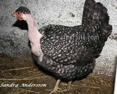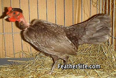 In France there are two varieties of Naked Necks. The Cou Nu has a completely naked neck, while the Cou Nu du Forez has a clump of feathers low down on the neck. They are only recognized there in White and are raised as a meat fowl.