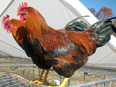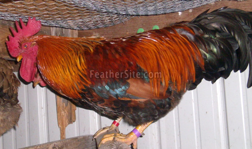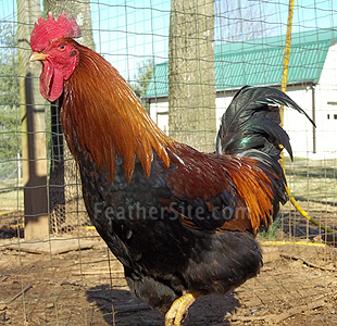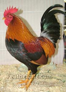 Black/red is the standardized color of the large form, although bantams also appear in Silver Duckwing.