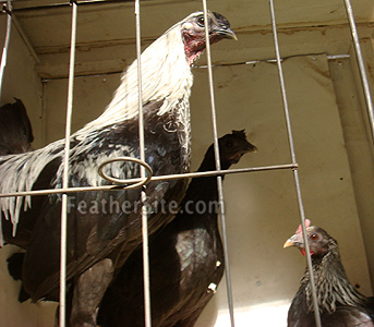 More British OEG bantams: Spangled male, Partridge and Blue females