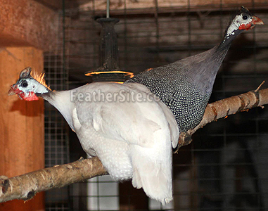 Domestic Guinea Fowl are found in many varieties, including Pearl (the wild type), White, Buff Dundotte, Royal Purple, Porcelain, Slate, Chocolate, Violet or Mulberry, Lavender, Pied, and Coral Blue.