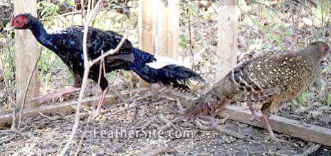 A juvenile Swinhoe Pheasant male on the left, and part of a female on the right