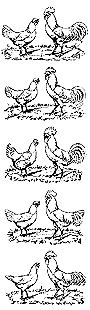 White Minorcas are splendid layers of large white-shelled egg. They will lay as many pounds of them as any other breed. Minorcas have a characteristic shape, different from all other breeds in the Standard. Because they are close feathered, they are considerably heavier than they appear to be. The shape of their body is a rectangle, and there is an abundance of fine grained meat on the frame work. Their stately carriage, broad prominent breast and massive body surmounted by an intelligent head, attracts attention everywhere. Their legs are long and of a strong construction. Minorcas mature early for their size, and it is not uncommon for them to begin to lay at the age of four and a half months. They are the largest “non sitting” breed in the Standard. Years before the Leghorns and Plymouth Rocks became the favorites, the old time white-faced black Spanish breed was considered the finest all-around breed for the farmer. They were used in crossing many other breeds principally for the size of their eggs and for their vigorous constitution. But times and fashions change, and when the feather-legged breeds had their innings, the old timers had to go into retirement for a while, to be resurrected again, when their turn came. At the present time, the smooth legged breeds are again occupying the stage and have for some time past, and our old friends, the Minorcas, still having their old shape and the same old qualities, are once more in the limelight. It's true that there are a few refinements; as for instance the coarse combs and faces are no longer wanted, and the shape of their body is perhaps a little longer than that of the birds of by-gone days but, on the whole, no radical changes have been made for the reason that they were “good enough from the beginning”. The desired standard weight of the White Minorcas is 8 lbs. for the cock, 6 1/2 lbs. for cockerel, 6 1/2 lbs. for hen and 5 1/2 lbs. for pullet. Their legs should be pinkish white in color, not slate like the black variety. Their skin is white. One of the most distinguishing points of the Minorcas is their head. It should be rather large and longer than high, and nicely rounded in front and back. The comb should be large compared with other breeds. The most common defects of the breed are about the same as we find on other large breeds. For instance: Coarse type, short in body (Fig. 3-male). Flat in breast, narrow, shallow bodies (Fig. 2-male ). Flat in breast (Fig. 5-male). Legs too short (Fig. 4-female). Curved back (Fig. 4). Tail carried high (Fig. 3-male). Scanty plumaged tails (Fig. 4-male). Leghorn type (Fig. 1). Pinched tails (Fig. 5-female). Knock-knees, hens bagged down behind (Fig. 3). Legs set back too far (Fig. 2-female). Too many or irregular serrations in comb (Fig. 4-male). Rear of comb turning in male (Fig. 2). Other defects are side sprigs and thumb marks, birds of small size, red in earlobes, white in face, off colored feathers in plumage, stubs, wrinkled faces & wattles, brassiness, etc. |