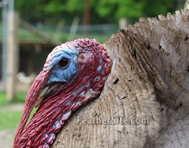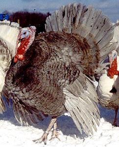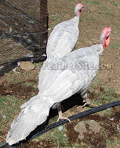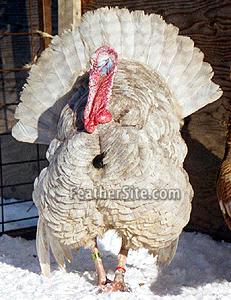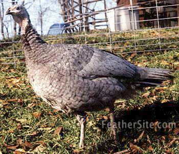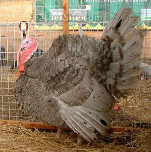 This variety is very interesting, and I will attempt to explain what can happen in breeding this color. First, I will try to define each color that occurs. A Slate is also called a Splash and is slate or ashy blue with specks of black scattered over the feathers. The Blue is more of a solid, dull, grayish-blue with the hens a lighter bluish gray. The Black is just that, black. When breeding Blue to Blue, the results are turkeys of three different colors: Slate, Blue, and Black. When breeding Slate to Slate, the results are just Slates and Slates will breed true. When breeding the Blue to Black, both Blues and Blacks result with no Slates. When breeding the Black to Black, just Blacks result, which breed true. This variety was not used on a large corporate basis, but was one ot the colors that was used by farmers to distinguish a flock of turkeys from a neighbor's flock and, thus, did have a market value when more turkeys were being raised on individual farms than on large corporate farms. The survey found 108 females and 35 toms, amongst twelve breeders, which is 5% of the Historical turkeys. More breeders are needed!