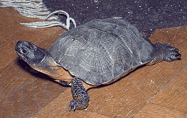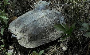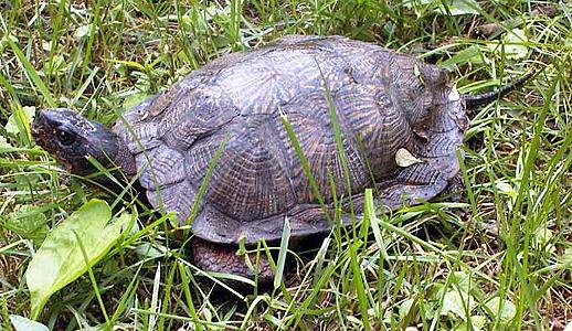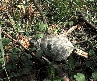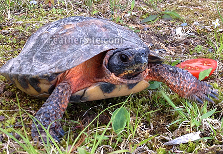 A male wood turtle in his natural habitat. Note the radio transmitter and antenna at the upper center of the picture.