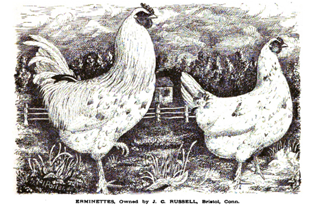 When one looks at the picture of J.C. Russell's Erminettes, it's clear that they look to be a variety of the Brahma as known to look at that time. However, it appears that Mr. Sutliffe considered his creation a separate breed due to him naming the birds Erminette instead of coining them as Erminette Brahma which would have signified them as a variety instead of a breed. To add to the notion that Mr. Sutliffe considered his creation a separate breed we find noted in another article written for The Poultry Monthly in 1887 the following; "Of these birds Mr. Redding says: 'The Erminettes are a distinct American breed, originated in this country about twenty years ago by using a pair of handsome fowls imported from the West Indies, and judiciously crossing them with fowls having the blood of Earl Derby Game, White Leghorn, and Light Brahma, in order to produce a fowl of handsome plumage, with yellow legs, small combs, and the weight of the Asiatics'."