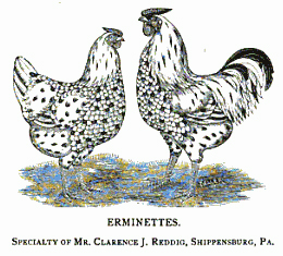 While Mr. Sutliffe's Erminette was the first exhibited under this breed/variety name, within the next two decades, birds exhibiting rose combs, single combs, clean legs, and bodies resembling the Wyandotte and Rock were all being raised and marketed under the banner of Erminette. According to written accounts, we can document the individuals accredited to the creation of the various Erminette types as follows: