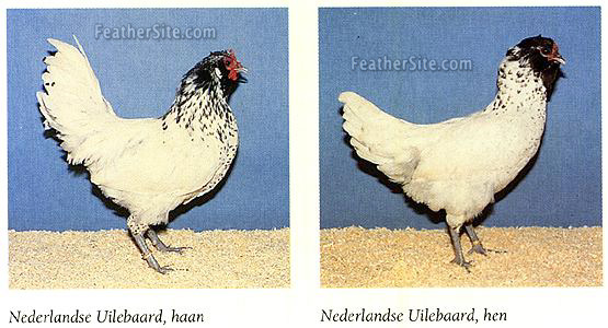 The Owlbeard is a very old, if not the oldest, Dutch poultry breed. It appeared in many paintings from Old Dutch masters. There is some sort of relation between it and the bearded Poland. Certain breeders believe that Polands were cultivated from this breed. Later on, crossings between them and the Kraaikop, Thüringer bearded fowl and La Flèche were made to maintain the breed. They have no wattles and instead we find a beard and muffs, which cover the "chin and cheeks." Very striking is the horned cock's V-shaped comb. This is nearly twice as high as that of the hen, respectively two and one centimetres. The Owlbeard is a rather large ornamental chicken with a beautiful upright carriage and a sloping, medium long and -wide backline. Characteristic is the broad, deep and full breast and the richly developed neck hackles. The upright tail is also well developed with nice, broad tail coverts and long, broad and well-curved sickle feathers. The eye colour is brown-red and the earlobes are white. The colour of the beak depends on the colour variety. This also is the case with the leg colour, which is white pinkish for the Cuckoo variety, light blue-grey for the White and slate blue for the Golden Spangled variety. The Owlbeard is known in Black, White, Black-laced Blue, Cuckoo, Golden and Silver Spangled, Yellow-white Spangled, Golden Pencilled, and Silver Pencilled varieties as well as the so-called Moorhead. The latter is known in White, Blue, Golden and Buff varieties with a totally black head. This is a very attractive variety.