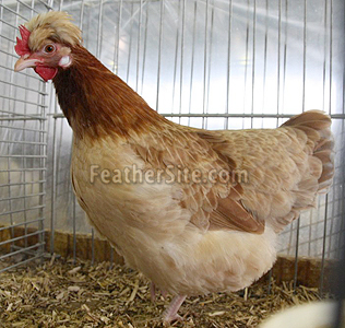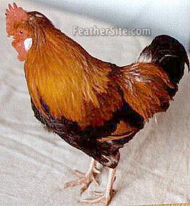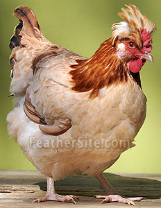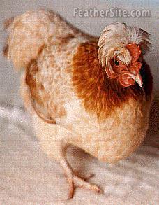 As befits a table bird it is classed as a heavy breed with a deep full breast and solid body carried on strong thighs and shortish legs. Although Houdans, Dorkings and Cochins were reputed to have been used in their development the Sulmtaler has four toes, so the rather dominant five toe gene was bred out. The bantam is a miniature replica of the large. Their lack of quantity of meat is made up for by the seemingly, endless number of eggs, they lay. This pert, lively but very docile breed comes in one colour only - the male black breasted, neck and saddle a glowing golden red and the pretty wheaten female has a cream breast and body, lighter golden brown neck hackle than the male. Their most striking feature are their crests - a tuft of brown red feathers behind the males straight, upright and single comb. The females' "S" shaped comb is surmounted by a medium full half round, light wheaten crest. In Germany and Holland the large Sulmtaler is considered to be a rare breed. At recent shows in Germany the ratio has been one large to every four or five bantams. So, as often happens, lack of space and the high cost of feed stuff has curtailed the numbers of large fowl.
