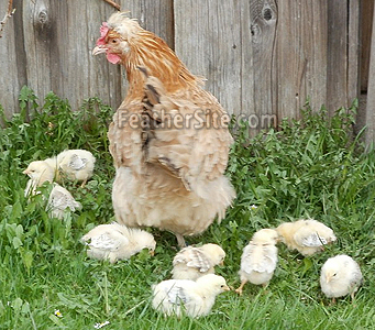 A Sulmtaler hen with two-week-old chicks