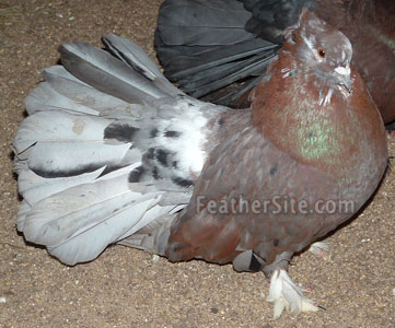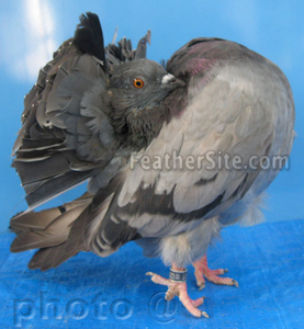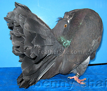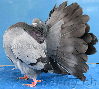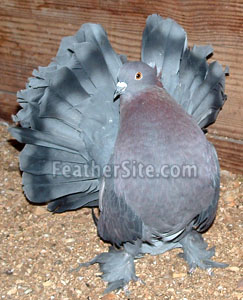 There are 2 common forms: Indian Fantails and American Fantails. The Indian fantails are much larger, crested and have feathered feet. They also have a fairly natural stance, while the American form stands on tip-toes and leans way back, with head almost buried between the breast and tail.