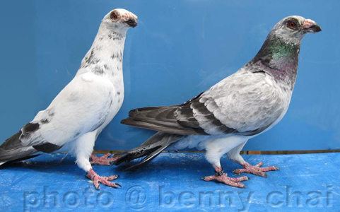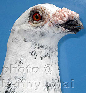 The large wattle above the beak is characteristic of this old English breed of pigeon. A good Dragoon will show wattle only on the upper beak. It carries the blood of the Tumbler and the Horseman, an extinct English breed. The beak is stout and quite blunt. The head sits erect on a wedge-shaped body. Common colors are white, blue-bar, dun, red, yellow and blue check.